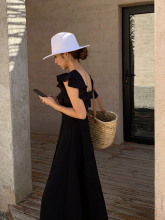 NEVA HU黑色V领开叉连衣裙女夏新款荷叶边吊带裙子气质收腰中长裙¥178
