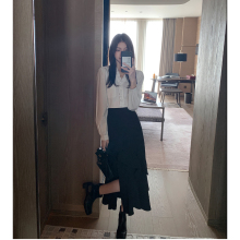 WOWYIKO 汤汤蛋糕裙女秋冬新款荷叶边设计感高腰显瘦黑色长款裙子¥299