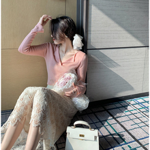 CloudSweet 丝绒般甜美 金秘书v领衬衫蕾丝半身裙通勤套装秋季女¥219.99
