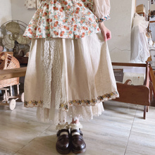 森系淑女蕾丝荷叶花边松紧腰半身裙清新花朵刺绣中长款棉麻长裙¥148