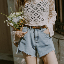 白水女 破洞牛仔热裤女夏辣妹设计感宽松高腰显瘦阔腿浅蓝色短裤¥119