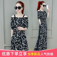 雪纺阔腿裤套装女2019夏季新款女装时尚露肩收腰上衣+阔腿裤夏装¥217.31