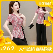 贵夫人高端休闲套装2022新款夏装女装碎花雪纺T恤衫阔腿裤两件套¥262.58