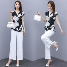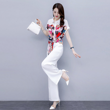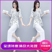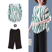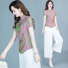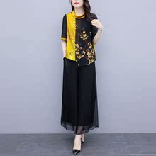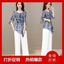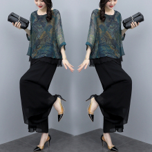 印花雪纺小衫女两件套装2021年新款夏季上衣阔腿裤宽松显高妈妈装¥346.83