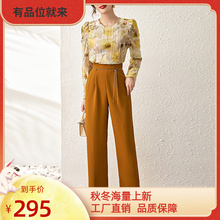 2022秋冬高级感小众油画印花雪纺衬衫+直筒阔腿西裤时尚套装通勤¥395