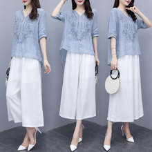 2022新款女装夏季刺绣雪纺衫上衣棉麻阔腿裤两件套休闲时尚套装女¥198
