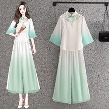中国风改良旗袍套装2022夏季新款年轻款复古雪纺刺绣上衣+阔腿裤¥69