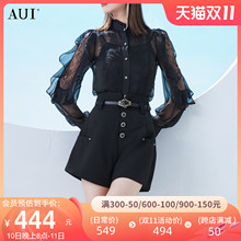 AUI黑色气质立领雪纺衬衫套装2022女夏新款小个子阔腿短裤两件套¥549