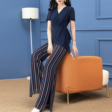 首尚格释条纹阔腿裤套装女夏两件套2022新款蓝色雪纺衫时尚洋气¥429
