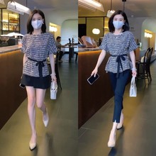 夏季2022新款女装时尚雪纺衫两件套气质名媛蓝色格子阔腿裤套装¥199