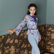 Magic Q原创 柔雾蓝立领鸢尾印花雪纺系带衬衫高腰刺绣阔腿裤套装¥638