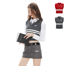 AYF经典V领背心 复古美式学院撞色条纹马甲背心刺绣衬衫套装女¥199