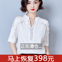 蕾丝上衣女款七分袖夏季雪纺小衫中袖妈妈宽松遮肚气质桑蚕丝t恤