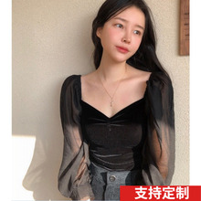 2022新款夏早秋女性感蕾丝网纱上衣ins薄款内搭打底雪纺衫长袖t恤