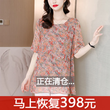 妈妈雪纺衫短袖碎花t恤女夏季装中长款宽松小衫遮肚子桑蚕丝上衣