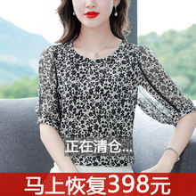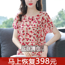 碎花小衫减龄桑蚕丝t恤女短袖夏季薄款中年妈妈宽松遮肚雪纺上衣