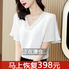 真丝衬衫女短袖桑蚕丝t恤夏季新款漂亮雪纺妈妈宽松v领碎花小上衣