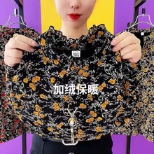 半高领加绒打底衫女长袖T恤女碎花雪纺加厚保暖秋冬妈妈上衣洋气