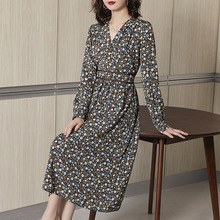 长款连衣裙女2022春秋新款长袖V领碎花裙子气质大摆收腰显瘦长裙