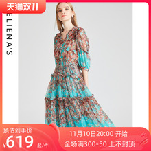 脱尘。秋冬女装连衣裙小碎花印花长袖V领收腰高腰大摆度假长裙潮