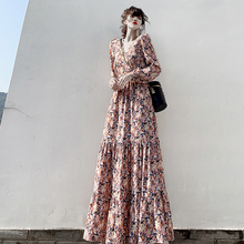 长袖碎花雪纺连衣裙女秋脚踝2022新款长款大摆沙滩裙裙子过膝长裙