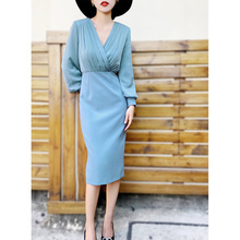 ICELOLLY法式v领长袖秋季连衣裙女深秋2022新款雪纺泡泡袖长裙子