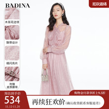 芭蒂娜粉色蕾丝连衣裙2022新款减龄收腰遮肉长袖雪纺长款裙子女