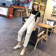 白色背带裤女韩版宽松春秋2022年新款小个子显瘦九分破洞牛仔裤