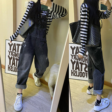 老玛儿 时尚宽松破洞牛仔背带裤女2022年春秋季新款韩版连体长裤