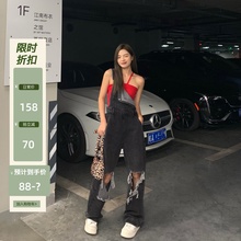 破洞牛仔背带裤女2022年新款夏季宽松显瘦大码高腰阔腿拖地裤ins