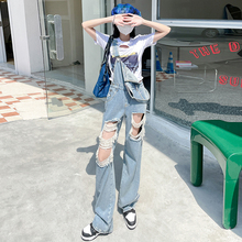 【梦婷家】破洞宽松直筒背带裤女2022夏季新款高腰显瘦吊带牛仔裤