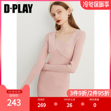 DPLAY2022冬通勤时尚玫瑰紫色不规则斜搭领修身针织连衣裙
