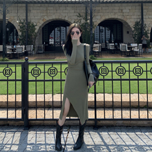 MULVAN 针织长袖连衣裙女2022新款不规则开叉修身裙子设计感小众