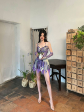 VOCK原创 鸢尾花 暗黑重工小众设计灰紫纱浪漫不规则抹胸裙连衣裙