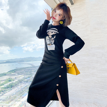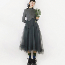原创半高领羊绒网纱连衣裙A字裙修身显瘦毛衣针织打底不规则长裙