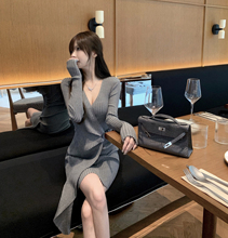 剩饭CellcHok 法式不规则V领百搭高级感长裙女秋冬针织长袖连衣裙