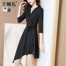 秋装新款2022黑色修身显瘦气质V领拼接条纹不规则中长款连衣裙子