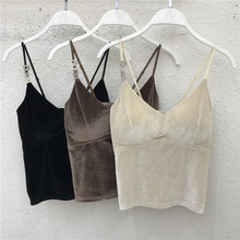 性感金丝绒吊带女秋显瘦内搭V领褶皱镶钻短款上衣露背打底小背心