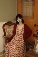 喵吉 甜美温柔风V领收腰印花吊带裙小个子中长款连衣裙两件套女秋