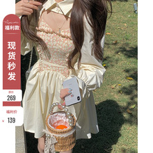 短裙 法式小众V领一片式系带白色碎花连衣裙两件套