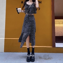 2022年新款春夏黑色罩衫碎花短裙两件套装高级感法式吊带连衣裙子