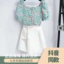 2021春季新款复古时尚碎花上衣+小清新高腰半身短裙两件套女套装