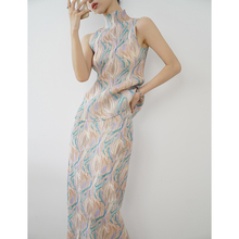 深深定制油画晕染三宅褶皱立领背心上衣温柔气质包臀半身裙两件套