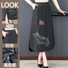香云纱国风半裙女春夏季a字中长款高腰显瘦妈妈真丝刺绣半身裙子