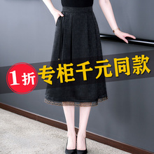 真丝丝绒半身裙女秋冬中长款蕾丝拼接高腰开叉黑色包臀一步半裙子