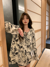 邱肉瑶 秋冬新款V领高腰印花荷叶袖气质系带高级感长袖连衣裙女