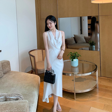 高端2022新双排扣显瘦长袖打底修身中长款前开叉荷叶边连衣裙女春