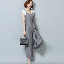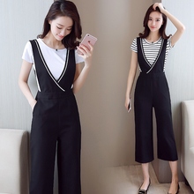 短袖条纹吊带连体裤高腰西装直筒背带九分裤显瘦韩版两件套装女夏