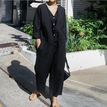 纯诗曼夏秋新款双v领棉麻连体裤女宽松大码九分裤时尚休闲亚麻裤