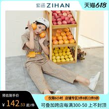紫涵夏装女士工装风显瘦九分连体裤森系衬衫领短袖上衣连身裤新款
